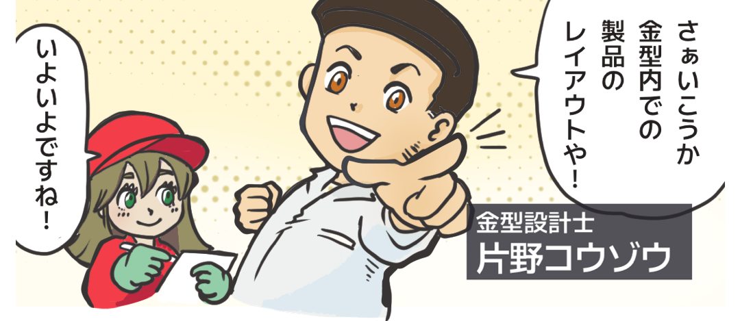 まずは、どうやって配置するのがベストか。その結果金型がどんな大きさになるか…を決めるんや。