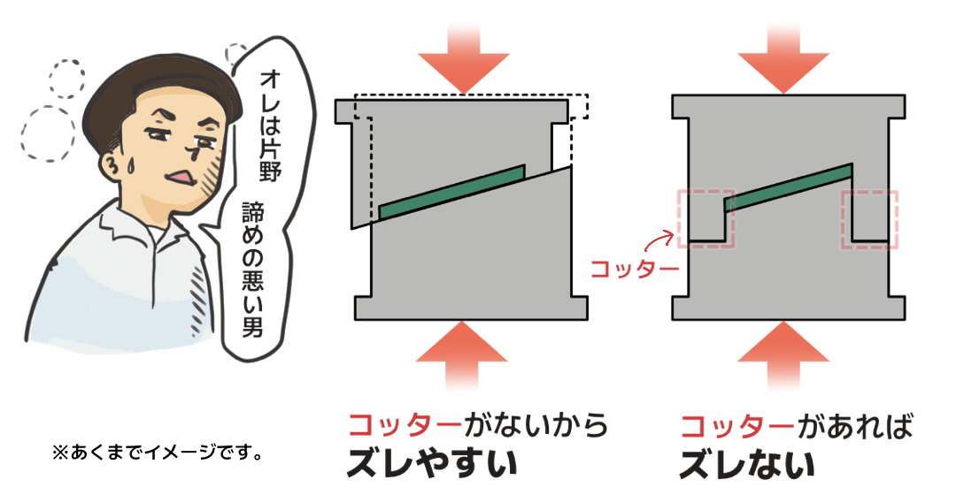 たいていの場合、「コッター」と呼ばれる構造を金型に設けて、キャビティとコアのズレを防ぐようにするんや。というのも、成形時には金型を超高圧で締めるから、製品の形状によってはキャビティとコアがズレたり、変形したりすることがある。それを防ぐための、ズレをガッチリ食い止める“噛み合わせ”の構造──これがコッターや。