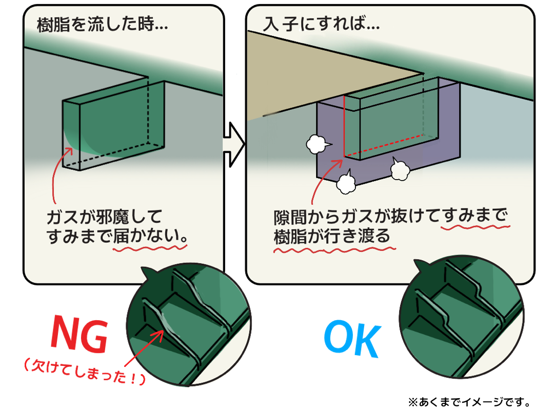 プラスチックを成形するとき型の中にはもともと空気が入ってるし、射出された高温の樹脂からは材料特有のガスが出てるんや。その空気やガスが型の外に出てくれんと樹脂が完全に金型に充填されず、製品の一部が欠けてしまう不良になるんや。
